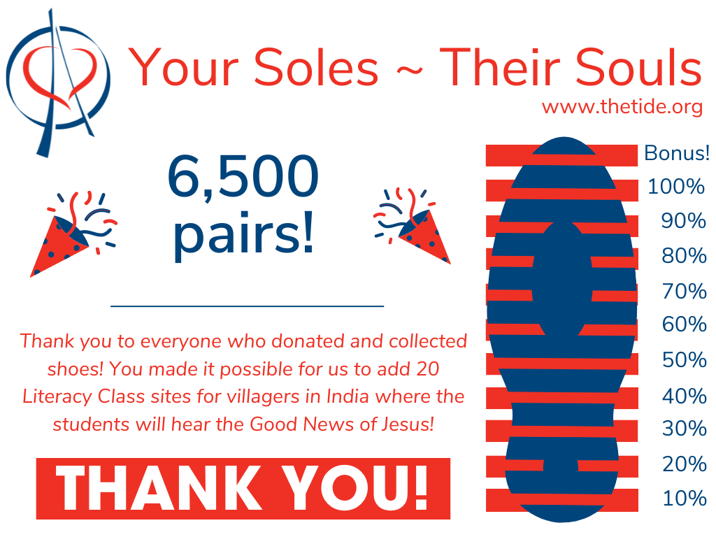 Thank you to everyone who made the 2024 shoe drive a HUGE success! Together we collected 6500+ pairs of shoes which will be used to make a difference in the lives of microbusiness owners in developing countries as they sell them to make a living to support their families. In addition, The Tide ‘boots on the ground’ partners in India will be able to open 20 new Literacy classes to villagers, allowing them to learn to read and write while hearing about God’s love for them.