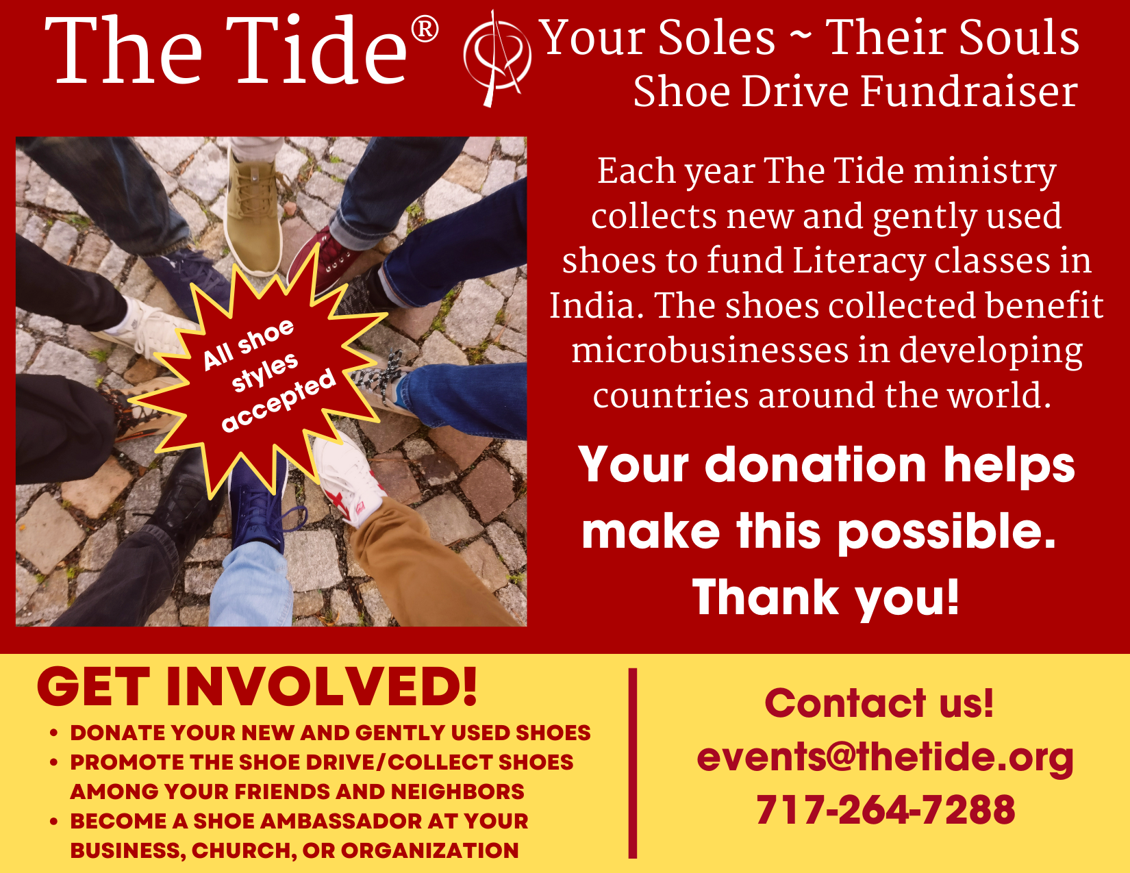 Through a community effort, new or gently worn shoes are collected and donated to The Tide ministry. Our partnering organization picks up the shoes at the end of the drive and sends us money for them. The funds collected are used for The Tide Gospel Outreach Literacy Classes in India. Our ‘boots on the ground’ team in India use Biblically based material in the classes, exposing the students to the Gospel as they learn!